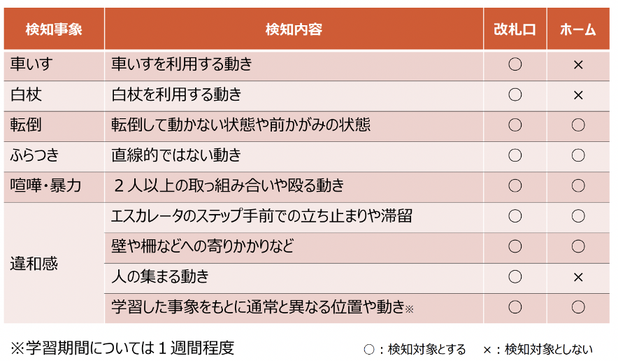 稲田「検知対象となる事象は大きく分けていくつかのグループに整理しています。具体的には『車椅子』『白杖』『転倒』『ふらつき』『喧嘩・暴力』『違和感』といった動作をカテゴリーとして設定しました。ただし、すべての場所で一律に検出するのではなく、利用状況に応じて制限を設けています。たとえば、ホーム上では電車に乗るために自然と人が並んだり、乗車口に集まることが多くあります。これをAIが誤って“異常な密集”として検知してしまうと、通常のご利用状況でもアラームが鳴り続けてしまいます。そのため、ホームでは一部の動作をあえて検知対象から外しています。