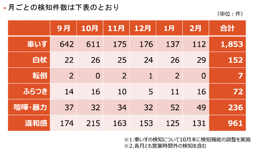 稲田「実証実験は2024年9月から2025年2月末まで行いましたが、特に2024年9月・10月は『車椅子』の検知件数が非常に多くなっていました。これは検知条件の初期設定によるもので、1人で利用している場合だけでなく、後ろから誰かが押していても検出される設定になっていたためです。ただ、その押している方がすでに介助者である場合は、改めて係員が対応する必要はないケースが多く、検知が過剰になっていました。また、ベビーカーやスーツケースなども誤検知の対象になっていました。たとえば、スーツケースに子供を乗せて押している場合や、足を動かさずスーッと動いているような場面は、AIにとっては車椅子と似た動きと判定されやすくなっていたんです。こういった要因から、検知件数が多くなりすぎたため、設定をカスタマイズしました。その結果、11月以降は件数が3分の1程度に減少し、落ち着いた形となりました。」