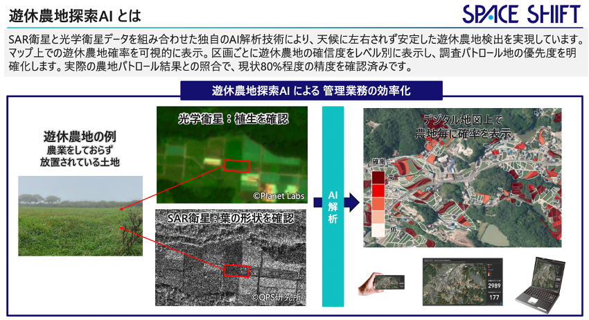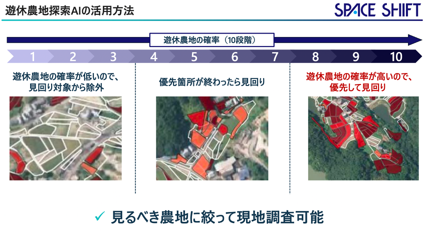このような課題を解決すべく、株式会社スペースシフトは、衛星データと独自のAI技術を駆使した「遊休農地*2探索AI」サービスを展開しています。このサービスは、広域にわたる自治体全域の農地を対象とし、遊休農地の可能性が高い場所を自動で検出・可視化するものです。